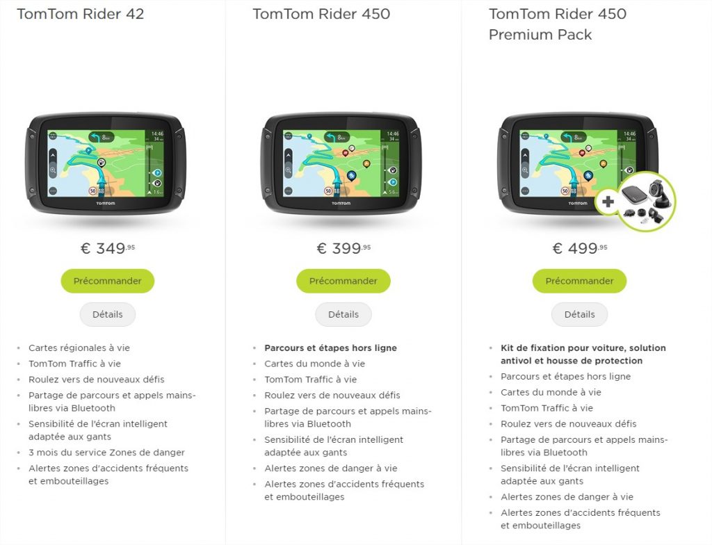 Grand nom du GPS autonome, TomTom vient d’annoncer la disponibilité de ses nouveaux modèles destinés au 2 roues. Les TomTom Rider 42, 4202 et 450. Pour effacer les erreurs des modèles précédents qui souffraient d’une interface lente au possible, TomTom est reparti de zéro et les nouveaux modèles bénéficient d’une refont totale. Mais ils ont gardés la spécificités de cette gamme dédiés aux motards qui cherchent non seulement à être guider dans leurs trajets mais également à profiter de routes fun à rider. Pour cela TomTom q intégré des itinéraires et des centres d’intérêt spécifiques.