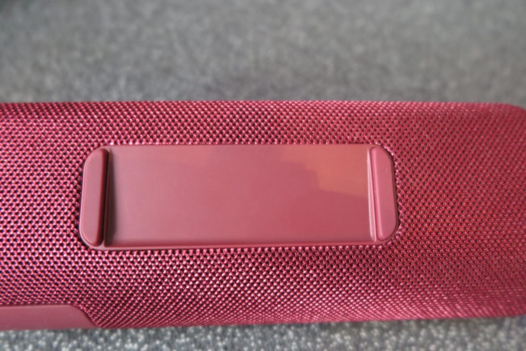 Sous l’enceinte un énorme pavé en caoutchouc entouré de deux pieds bien larges et bien éloignés l’un de l’autre, pour bien stabiliser l’enceinte et éviter de tomber. D’ailleurs la stabilité est excellente, une fois posée, l’enceinte ne bouge pas. C’est peut-être un détail, mais c’est important quand on sait que l’utilité de cette enceinte est tout d’abord d’être transportée et posée un peu partout, et non pas posée tranquillement sur la cheminée ou la commode.